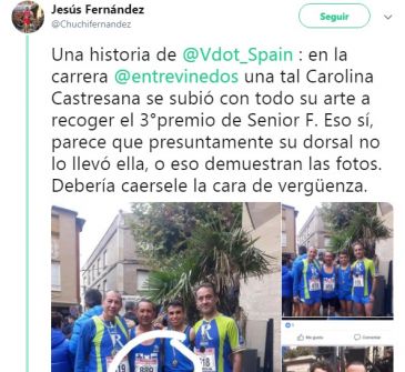 Registrada com o número 889 na Carrera Entre Viñedos de Cenicero, Carolina Castresana subiu ao pódio para receber o prêmio de terceira colocada em sua categoria. No entanto, Castresana não percorreu 1 km sequer pelas ruas da cidade. Ela repassou seu número de peito a um homem, que percorreu todo o trajeto e cruzou a linha de chegada por ela.