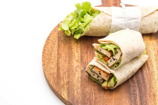 Coloque no disco do wrap as folhas de rúcula, a beterraba, o palmito, o tofu, a manga e por último a alface. Enrole delicadamente, mantendo os ingredientes dentro do wrap e, se necessário, coloque um palito para segurar e evitar que ele abra.