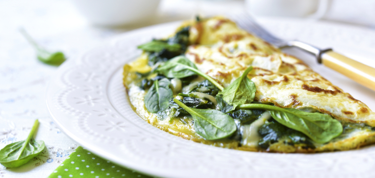 Aqueça uma frigideira média enquanto bate os ovos até ficarem na consistência de omelete. Adicione o sal e a pimenta preta e reserve. Derreta a manteiga na frigideira, refogue o espinafre por alguns segundos e adicione os ovos batidos, mexendo sempre para que o espinafre incorpore nos ovos.
